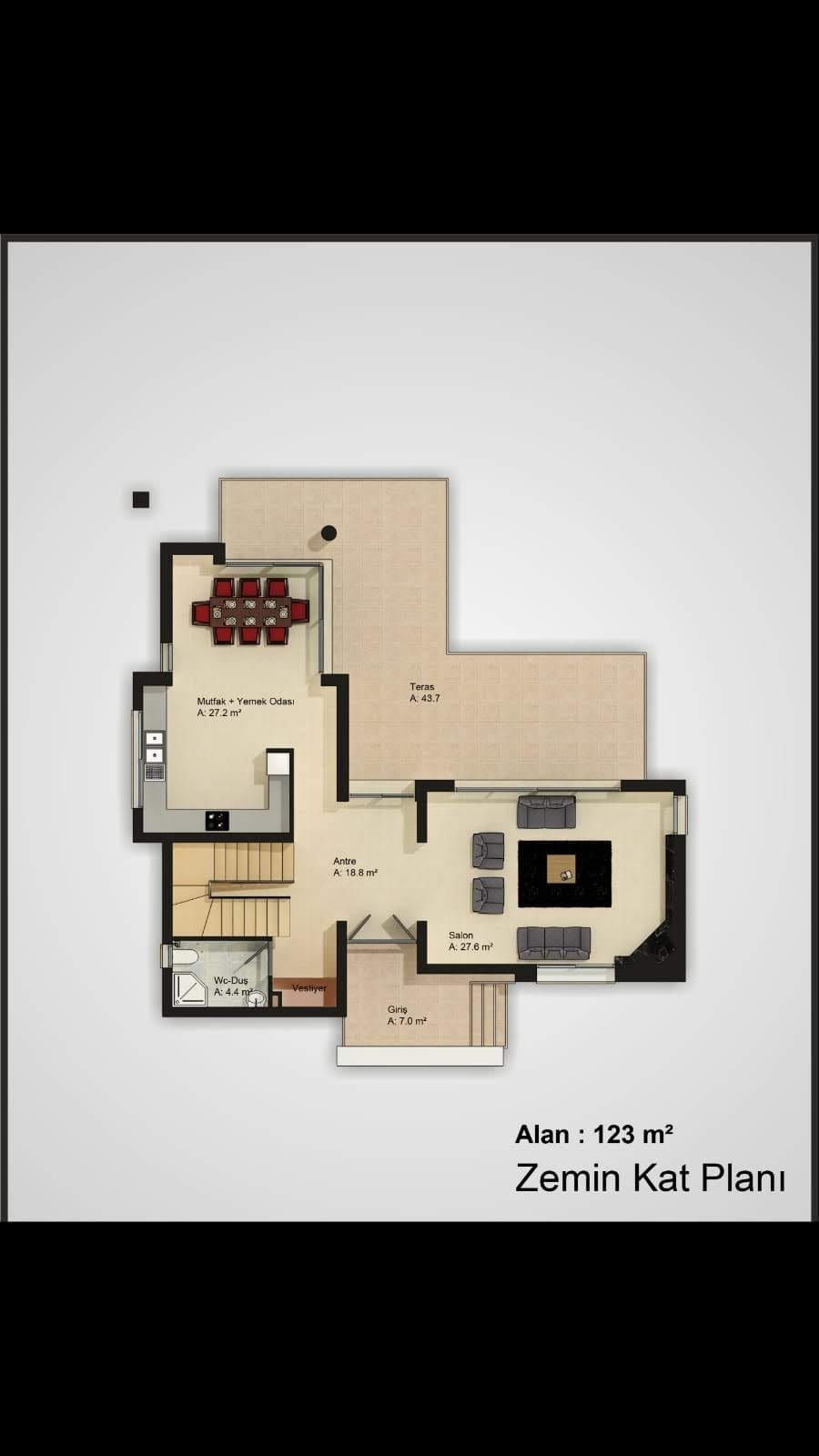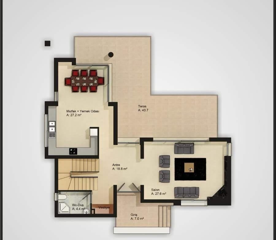 43.7 m2 Salon ve mutfaktan cikilabilen Teras