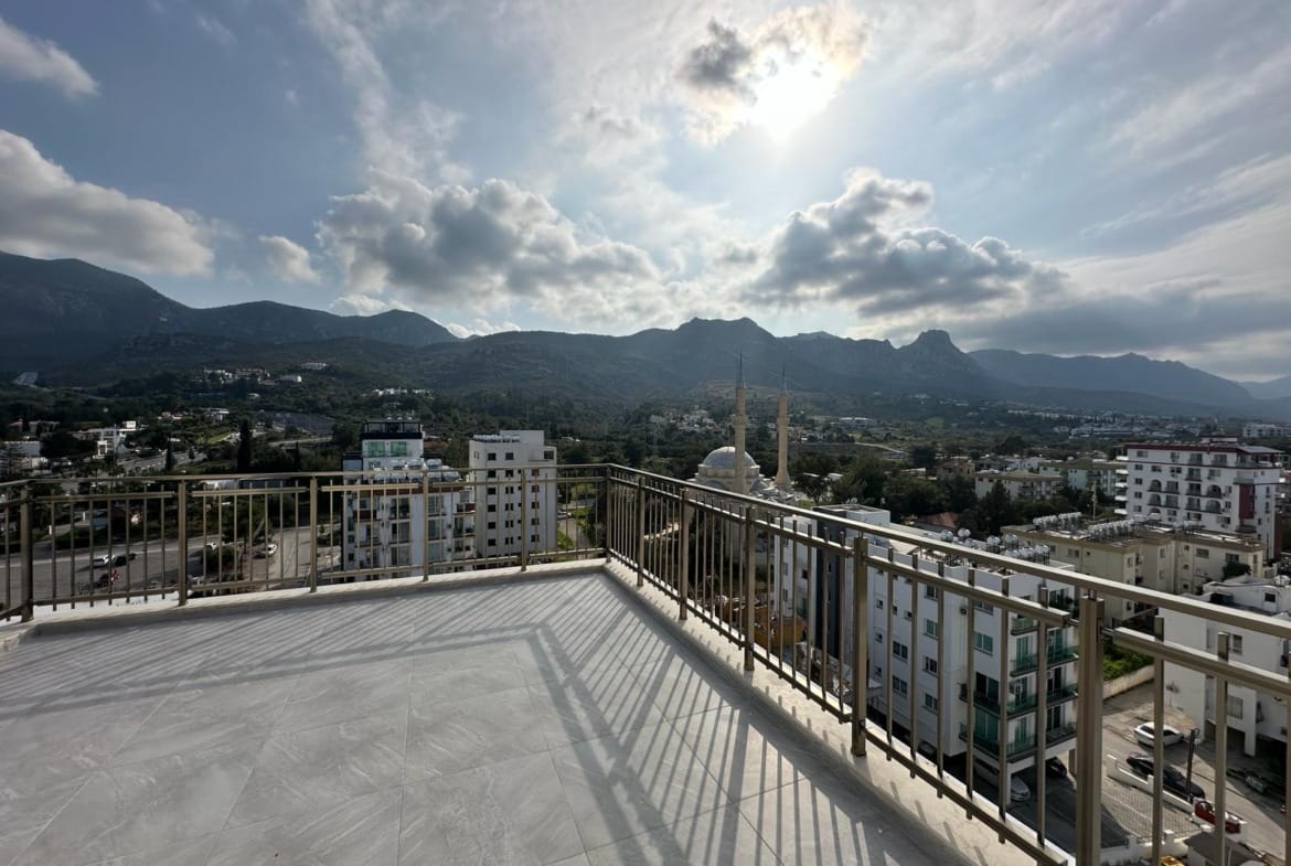 Girne’de Huzurlu Mahallede 3+1 Kiralık Geniş Balkonlu ve Teraslı Penthouse. Tam Eşyalıdır Çantanızı Alıp Yerleşebilirsiniz. 9 Katlı Binanın 9. Katında Bulunmaktadır Asansör ile Evinize Kolayca Ulaşım Sağlayabilirsiniz. Dairemiz Güvenlikli, Ebeveyn Banyolu ve Çelik Kapı Girişi Mevcuttur. Jeneratör ve Her Daireye Ait Otoparkta Mevcut. Market, Restoran Vb Yerlere Yürüme Mesafesindedir. 1500 GBP Kira ve 75 GBP Aidat Bedeli Vardır. 2 Depozit, 1 Kira Aylık Ödeme ve 1 Komisyon Ücreti Vardır.